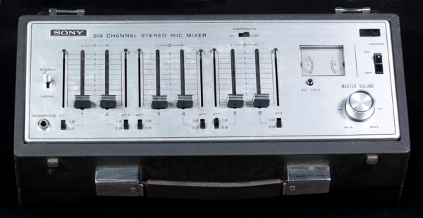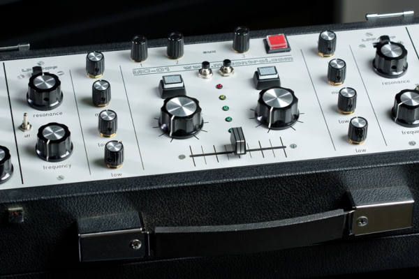 The Briefcase is built from the chassis of a 70′s-era portable Sony microphone mixer. It was conceived and built in 2006, and predates most DJ-oriented MIDI controllers on the market. Please view the gallery for details.